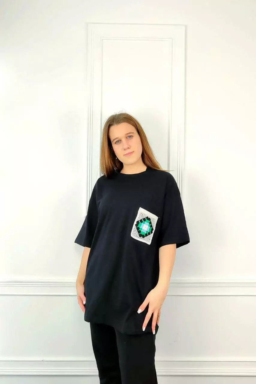 Молодежная женская футболка OVERSIZE 44-48 карман ромбик Чёрный