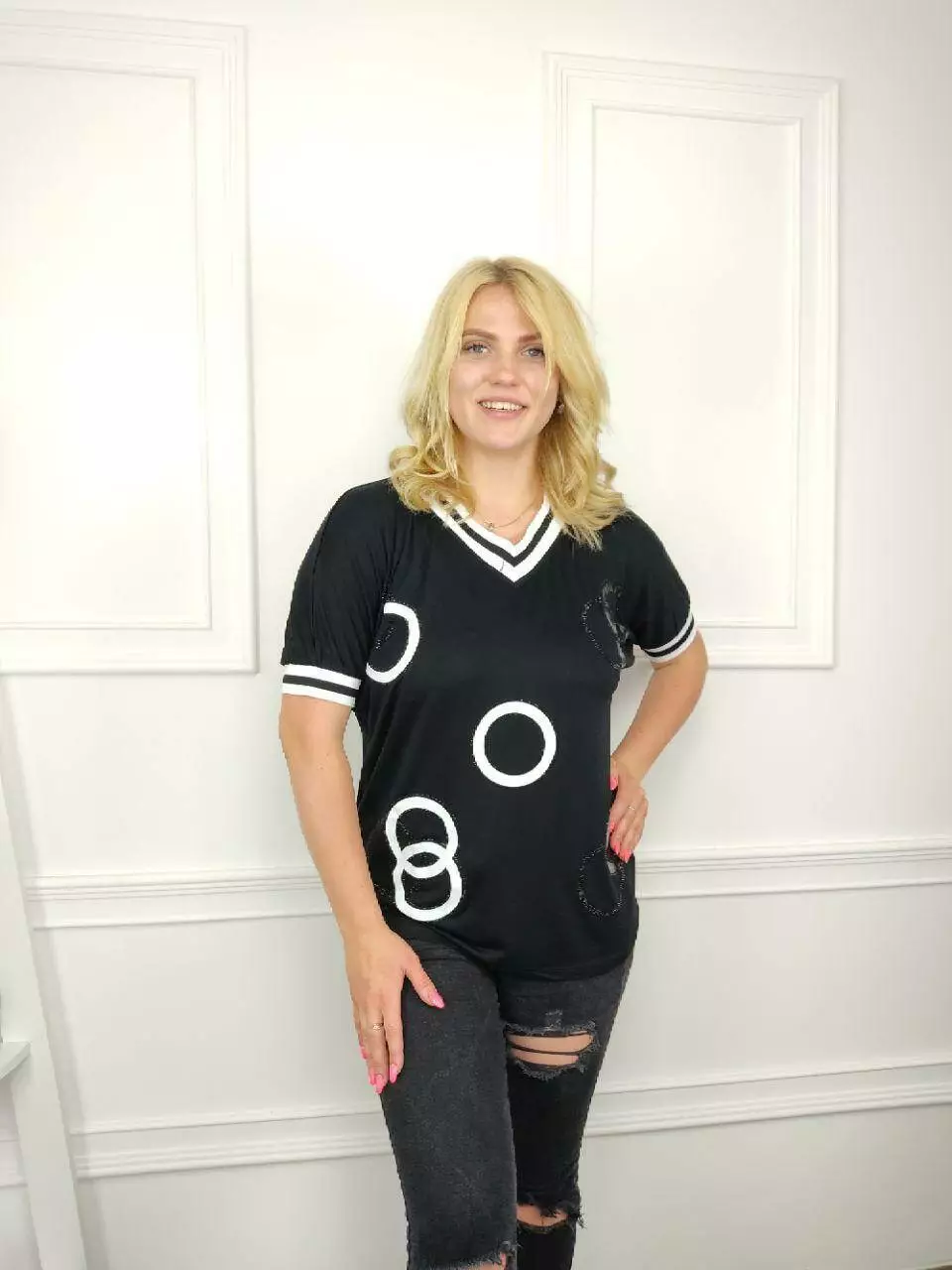 Женская футболка батал 52-54 56-58 черный принт круги